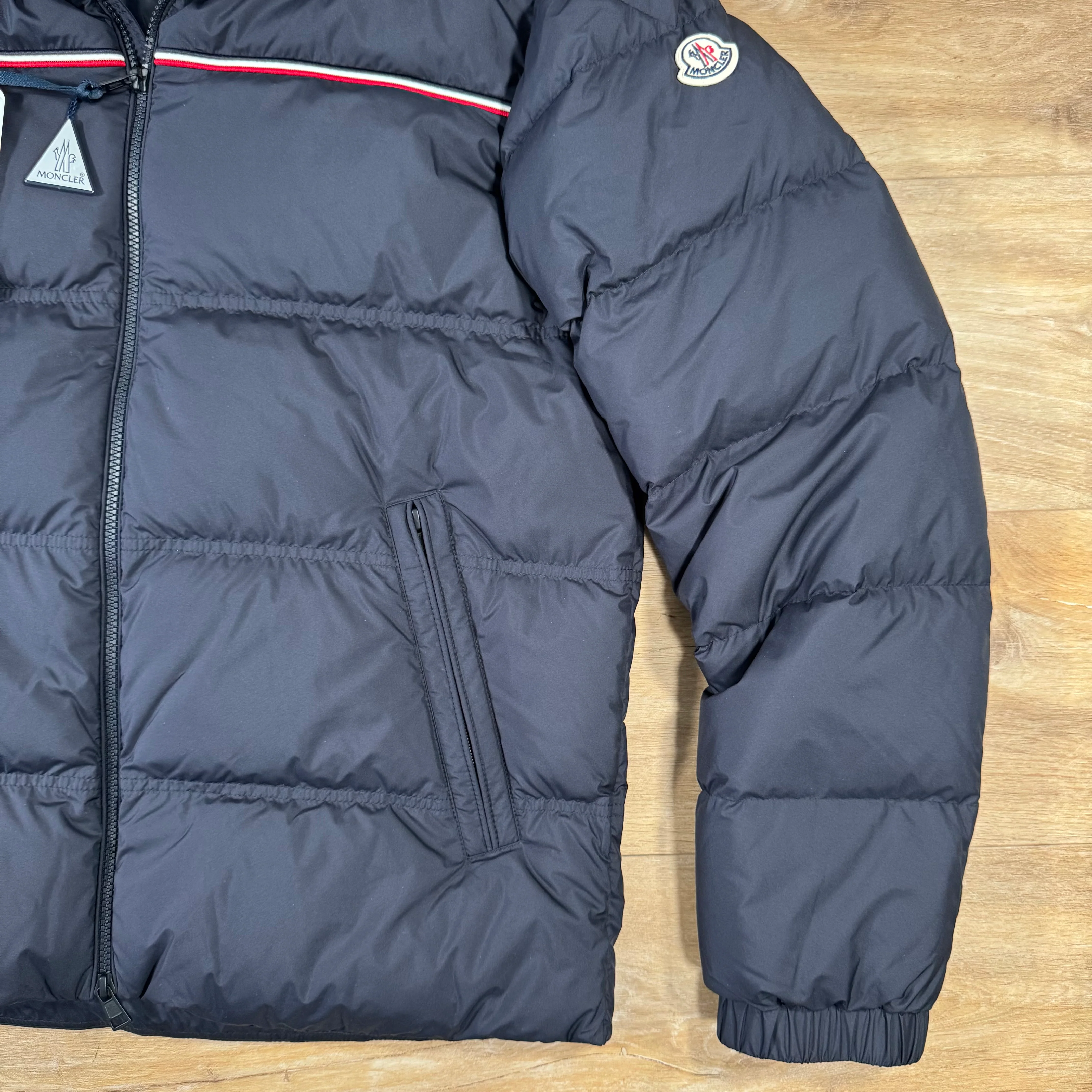 The Moncler Bouvaque down jacket is crafted in quilted nylon and padded with premium goose down for lightweight warmth. It features a standing collar, front zip closure, and pockets, along with long sleeves finished with elastic cuffs and the signature felt logo patch. A tricolor ribbon detail and adjustable drawstring hem complete this refined, functional design.